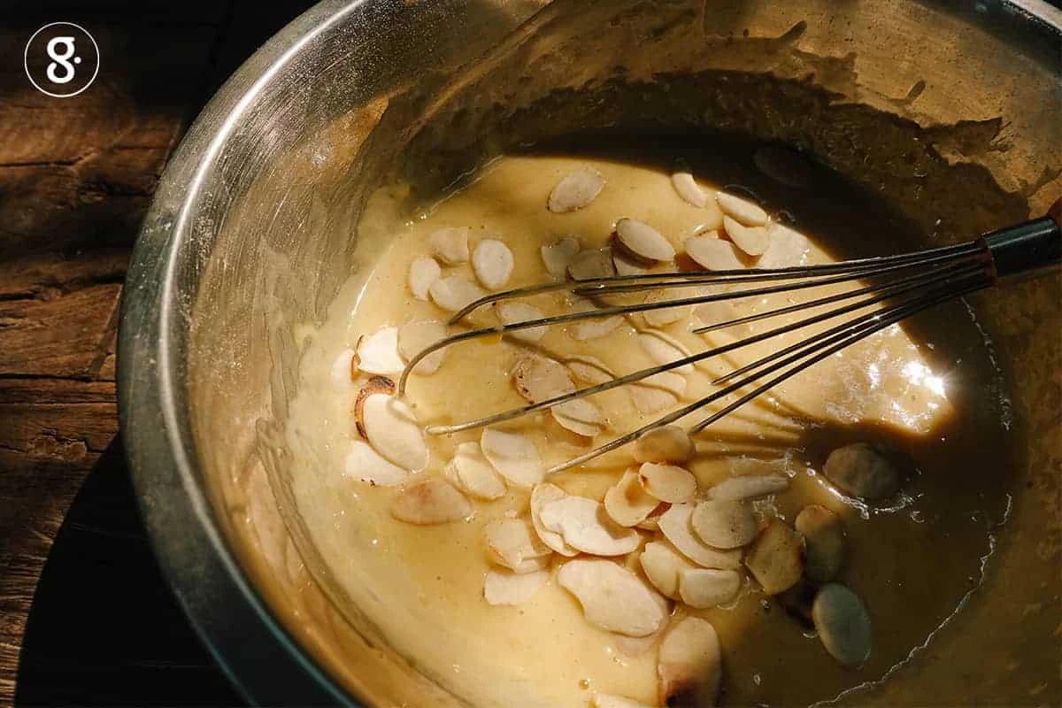 5. เติมเมล็ดกระบกที่คั่วแล้วใส่ลงไป ใช้ไม้พายคนเบาๆ ให้เข้ากัน