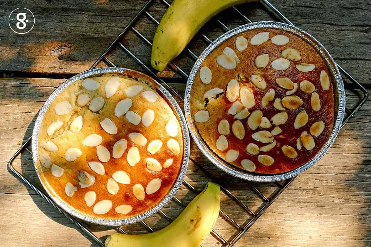 พอดีกับในสวนเล็กๆ ของบ้านเราเพิ่งให้ผลผลิตเป็น ‘กล้วยหอมทอง’ ที่เฝ้าประคบประหงมดูแลมานานร่วมปี เลยเป็นโอกาสอันดีที่เราจะพาสองของอร่อยจากคนละแหล่งปลูกมาพบกันในเค้กนุ่มๆ ชุ่มเนื้อกล้วย
