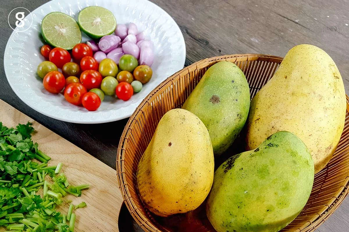 1. มะม่วงพันธุ์พื้นบ้านตามแต่หาได้ (ในที่นี้เราใช้ขายตึก ทองดำ ยายกล่ำ และหนองแซง เราแนะนำให้ลองชิมมะม่วงพันธุ์ที่คุณเลือกก่อนว่ารสชาติเป็นยังไง แล้วเลือกสัก 2-3 ชนิดให้รสชาติไม่ซ้ำกัน) หั่นชิ้นเต๋า