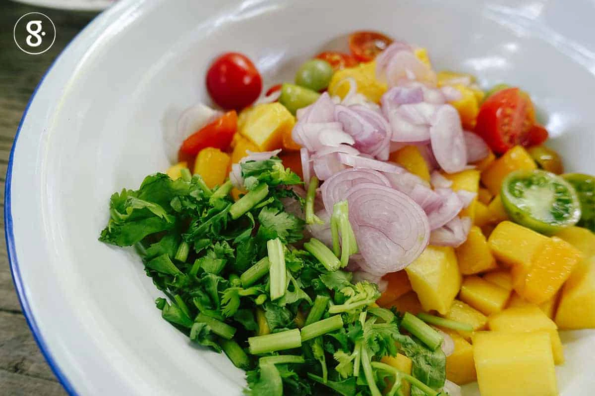 2. นำมะม่วงหั่นเต๋าลงมาคลุกกับเครื่องที่ผสมไว้แล้ว เคล้าเบาๆ จนเข้ากัน