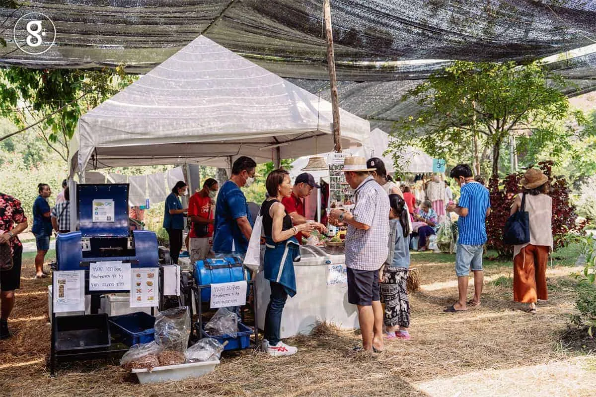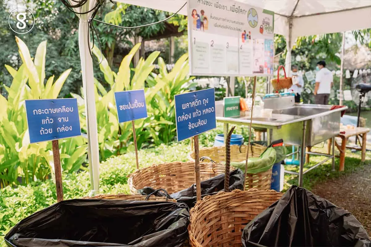 นอกจากบรรยากาศสบาย ๆ ของตลาดนัด ร้านค้า เวทีเสวนา และกิจกรรมต่าง ๆ แล้ว สิ่งที่สะดุดตาของผู้ร่วมงานทุกคน น่าจะเป็นจุดแยกขยะที่บริการทั่วทั้งงานทั้งหมด 6 จุด โดยจุดแยกขยะจะประกอบด้วยถังแยกขยะที่ค่อนข้างละเอียด ตั้งแต่ ขยะเศษอาหาร ขยะปนเปื้อน ขยะย่อยยาก เช่น ตะเกียบ ไม้เสียบลูกชิ้น พลาสติกยืด กระดาษ ขวดแก้ว ขวดพลาสติก กระป๋อง เป็นต้น นอกจากถังขยะแยกละเอียดแล้วยังมี จุดล้างภาชนะ จุดตากภาชนะ เพื่อให้ขยะปนเปื้อนที่ไม่สะอาดนั้นกลายเป็นขยะที่สะอาดมากขึ้น ซึ่งสามารถนำไปเข้าสู่กระบวนการรีไซเคิลต่อไปได้ นอกจากนั้นแต่ละจุดจะป้ายให้ความรู้ และมีเจ้าหน้าที่ประจำจุดให้ความรู้ขั้นตอนในการแยกขยะ และวิธีการแยกขยะที่ถูกต้อง