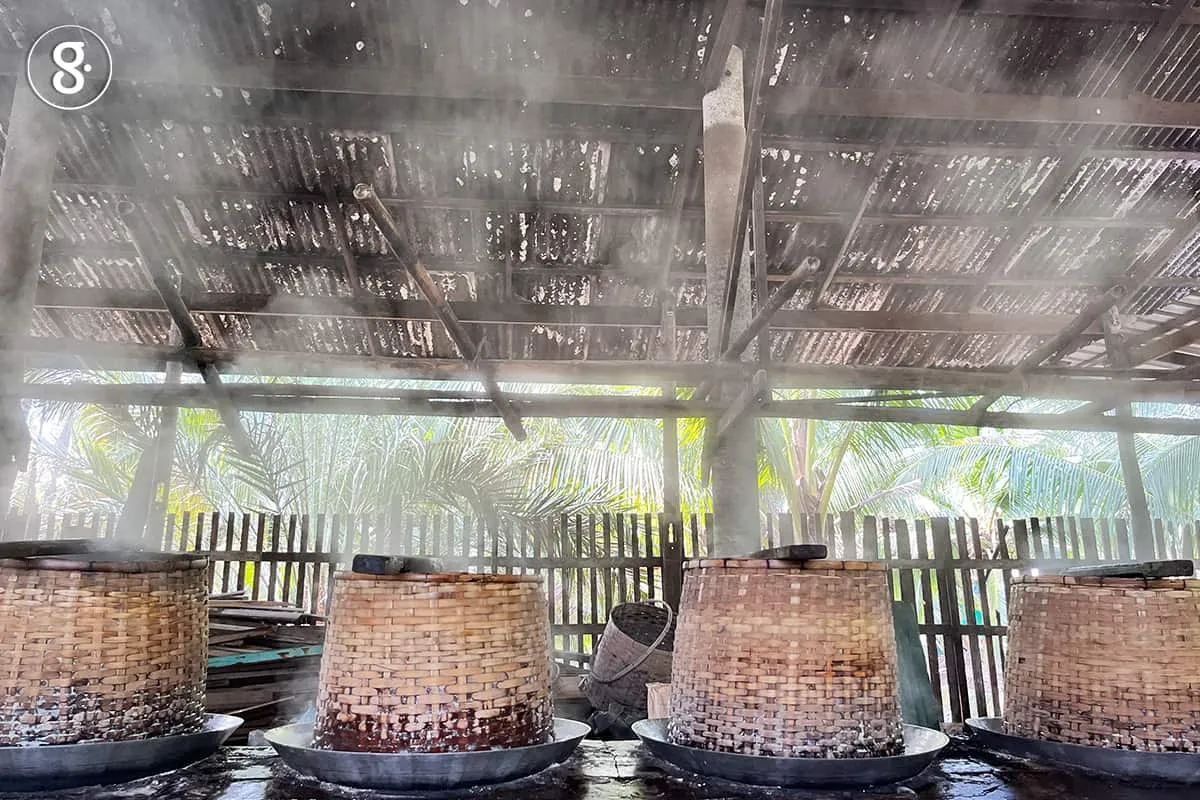 ดั้งเดิมนั้น การทำน้ำตาลมะพร้าวเป็นงานของครอบครัว สมาชิกทุกคนแบ่งหน้าที่ช่วยกันทำ แม้แต่เด็ก ๆ ลูกหลานก็ต้องช่วยขึ้นตาลก่อนไปโรงเรียนและหลังจากเลิกเรียน เพราะการทำน้ำตาลต้องทำทั้งงานในสวนและงานในโรงตาล มีรายละเอียดที่ต้องใส่ใจพิถีพิถันเยอะทุกกระดิก เป็นงานแม่ลูกอ่อน (สำนวนพี่เจี๊ยว) ไม่มีวันหยุด ต้องทำทุกวันต่อเนื่องจนกว่าจะถึงช่วง “พักตาล” คือหยุดให้ต้นมะพร้าวได้พัก ฟื้นฟูสภาพ ถ้าไม่บากบั่นพากเพียรและมีน้ำอดน้ำทนถึงปานนั้นจะเป็นชาวสวนตาลได้อย่างไร