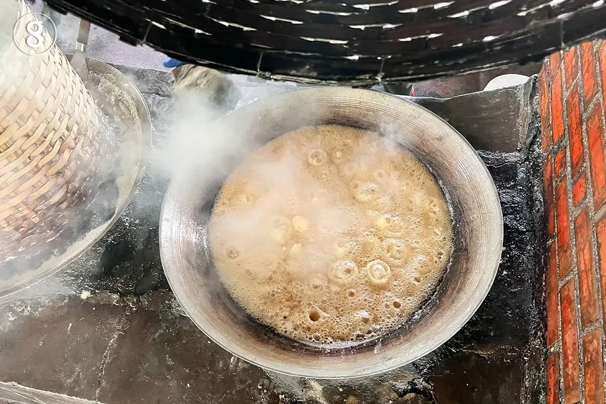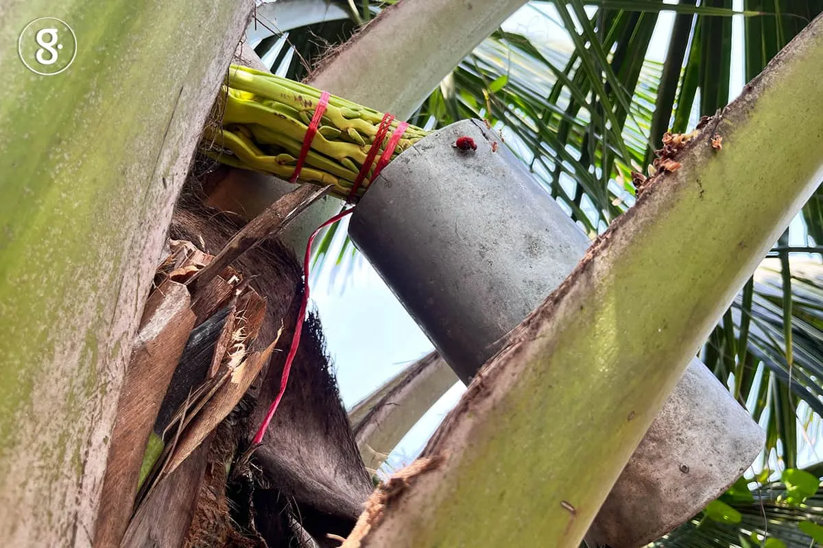 ที่สวนมะพร้าวทำตาล งานการแห่งชีวิตจะเริ่มต้นตั้งแต่เช้าตรู่ ชาวสวนจะปีนพะองขึ้นต้นมะพร้าวไปปลดกระบอกที่รองน้ำตาลไว้ข้ามคืนลง ใช้มีดปาดตาลที่คมเฉียบปาดหน้างวงตาลให้สดใหม่เพื่อให้น้ำตาลไหลดี แล้วเปลี่ยนเอากระบอกเปล่าไปผูกรองไว้แทนที่เพื่อจะมาปลดอีกทีในช่วงบ่าย ขึ้นตาลสลับสับเปลี่ยนกระบอกแบบนี้ทุกวัน วันละสองรอบ น้ำตาลสดจากแต่ละกระบอกจะถูกนำมาเทรวมกัน จากนั้นก็เข้าสู่กระบวนการเคี่ยว ต้มน้ำตาลใสให้เดือดปุดจนกระทั่งขุ่นข้น ยกจากไฟแล้วใช้ลวดกระทุ้งสะบัดให้เย็นลงและจับตัว แล้วบรรจุลงภาชนะ ได้เป็นน้ำตาลมะพร้าวที่เรียกชื่อต่าง ๆ กันไปตามภาชนะ สมัยโบราณบรรจุลงหม้อตาลดินเผาก็เรียก น้ำตาลหม้อ ต่อมาบรรจุลงปี๊บก็เรียก น้ำตาลปี๊บ พอใส่เป็นถ้วยก้อนขนาดครึ่งหรือหนึ่งกิโลกรัมก็เรียก น้ำตาลปึก
