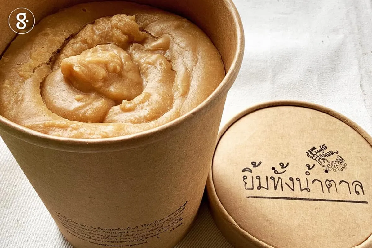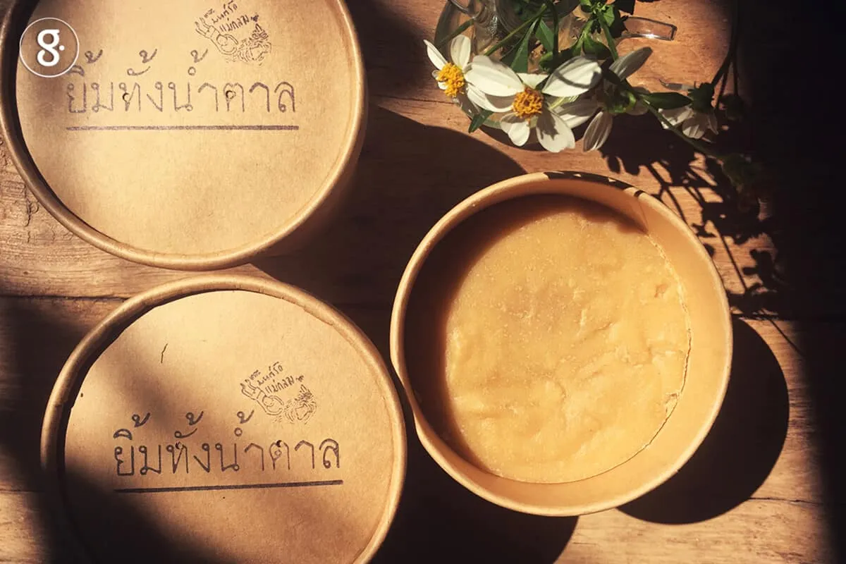 ช่วงเวลานั้น “เดอะมนต์รักแม่กลอง” ได้รับงบประมาณจำนวนหนึ่งจาก สสส. โจทย์คือการเยียวยาผู้ได้รับผลกระทบจากสถานการณ์โควิด-19 ทำให้เราเริ่มทำโครงการอุ้มชูเตาตาล หลักการง่าย ๆ คือ รับซื้อน้ำตาลแล้วนำไปขายหรือแจกจ่าย เงื่อนไขมีแค่ว่าเราจะทำกับน้ำตาลมะพร้าวแท้เท่านั้น เริ่มต้นด้วยการหาเตาตาลที่ยังคงการผลิตในวิถีเดิมคือ ขึ้นตาลวันละ 2 รอบ ซึ่งหมายถึงไม่ใช้สารกันบูด และเคี่ยวตาลโดยไม่ผสมน้ำตาลทรายหรือส่วนผสมอื่นใด แม้ไม่ถึงกับยาก แต่ก็ไม่ง่ายที่จะได้เตาตาลร่วมอุดมการณ์เดียวกัน เราออกแบบให้น้ำตาลใส่ลงในบรรจุภัณฑ์ที่ปลอดภัย สะดวกใช้ สามารถรองรับการเปลี่ยนแปลงตามสภาพของน้ำตาลได้ ย่อยสลายได้ และไม่ใช่พลาสติก ให้ชื่อผลิตภัณฑ์ว่า “ยิ้มทั้งน้ำตาล” สื่อความหมายถึงการใช้น้ำตาลฝ่าวิกฤต แม้ในความเศร้าแต่ชีวิตเรายังมีความหวัง