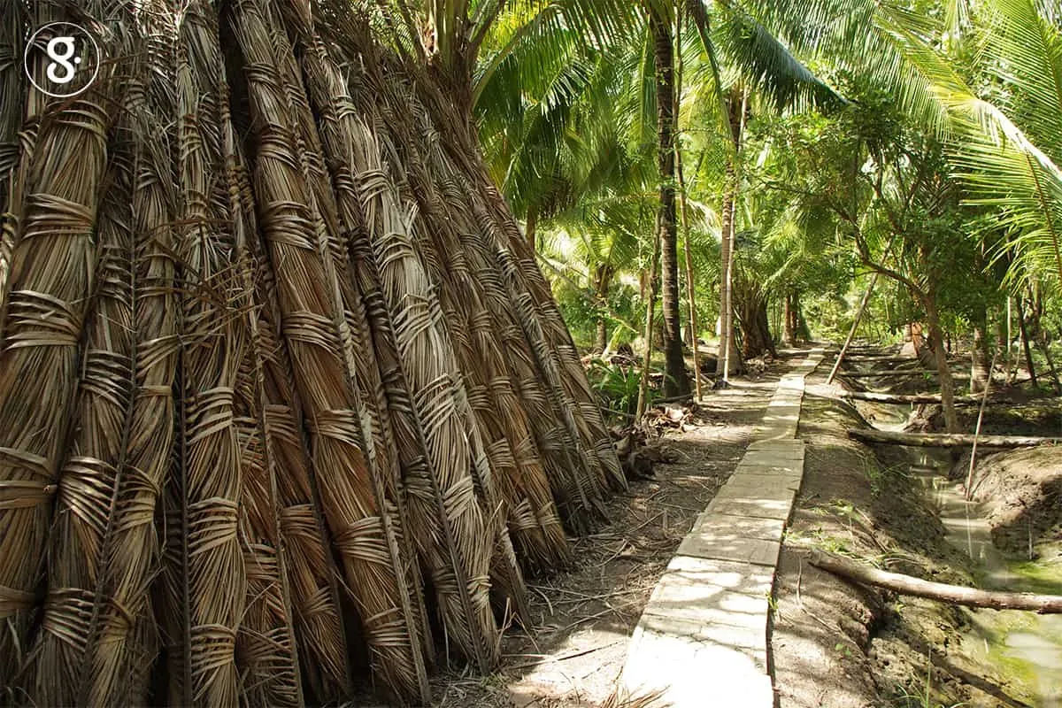 สวนมะพร้าวและรวมทั้งสวนผลไม้อื่นในแม่กลองล้วนเป็นสวนยกร่อง หมายถึงยกดินขึ้นเป็นคันสลับกับร่องน้ำ ไม่ใช่ที่แผ่นเต็มผืน น้ำครึ่งหนึ่ง ดินครึ่งหนึ่ง ปลูกพืชบนคันดินหลังร่อง ส่วนท้องร่องเป็นที่ให้น้ำเข้าถึง น้ำในที่นี้คือน้ำจากแม่น้ำแม่กลองนั่นเองซึ่งจะไหลเข้าสวนทั้งโดยตรงและโดยผ่านลำคลองสาขา แพรก ลำราง ลำกระโดง ไม่ว่าสวนของใครจะอยู่ลึกเข้าไปจากแม่น้ำขนาดไหน ระบบลำรางเหล่านี้ทั้งที่เกิดโดยธรรมชาติและเกิดจากฝีมือการขุดของมนุษย์ก็จะพาน้ำเข้าไปส่งถึง ทุกสวนมีน้ำใช้ถ้วนทั่วกัน เป็นน้ำที่ขึ้นและลงทุกวัน วันละสองรอบ ทั้งไม่ต้องใช้ปุ๋ย เพราะน้ำได้พัดพาดินตะกอนซึ่งมีแร่ธาตุสารอาหารมาเติมให้อยู่แล้ว