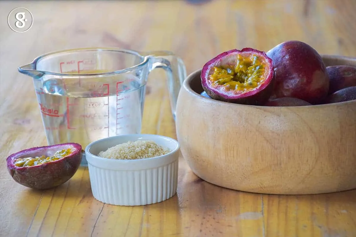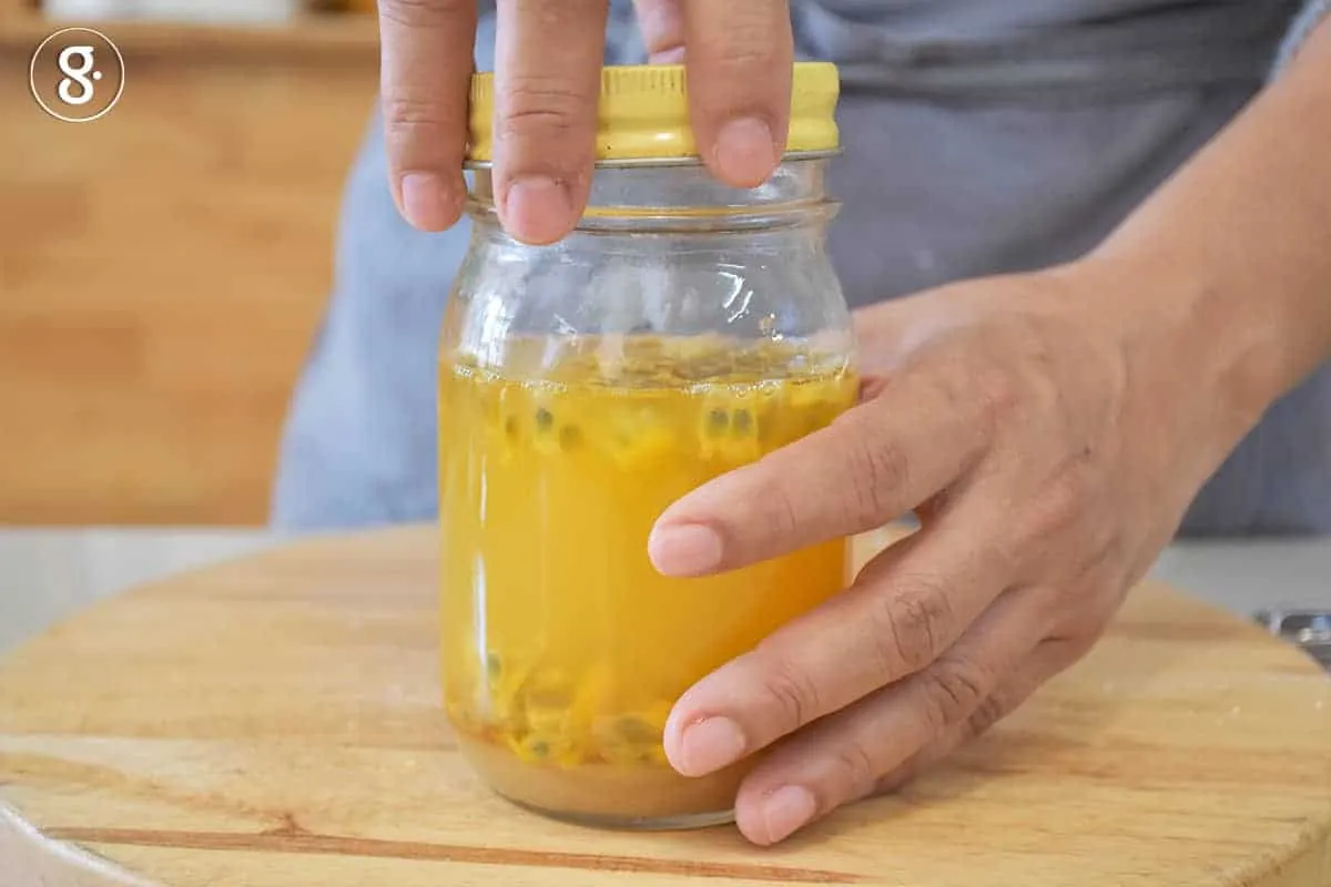 2. จากนั้นเติมน้ำดื่มสะอาดลงไป 300 ml. ต่อด้วยใส่เนื้อเสาวรสออร์แกนิกลงไป และตามด้วยน้ำตาลทราย ตามสัดส่วนที่ให้ไว้ ปิดฝาภาชนะให้สนิท