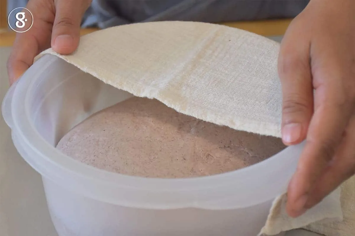 4. พักในกล่องพลาสติก คลุมด้วยผ้าชุปน้ำหมาด ๆ วางทิ้งไว้ที่อุณหภูมิห้อง ใช้เวลาประมาณ 4-5 ชั่วโมงหรือจนกว่าแป้งโดจะขึ้นฟู 2 เท่า