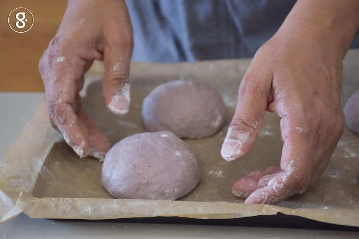 5. ใช้กำปั่นกดไล่อากาศ แล้วนำออกมาตัดแบ่งน้ำหนัก 100 กรัม/ก้อน คลึงกลมให้ผิวเรียบตึงและวางพักไว้บนถาดอบให้มีระยะห่างกันประมาณ 10 ซม.ค่ะ