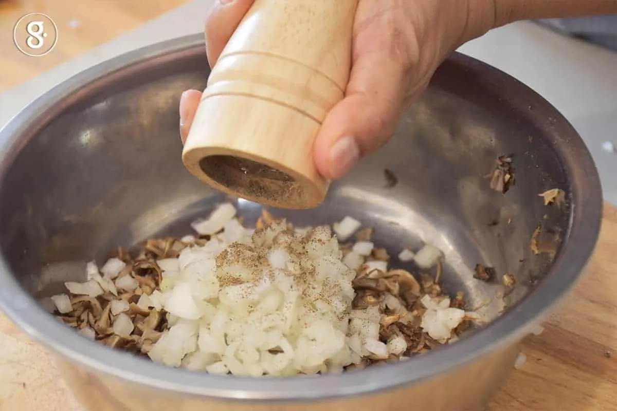 3. ผสมเห็ด หอมหัวใหญ่ แป้งข้าวโพด คลุกเคล้าให้เข้ากัน จากนั้นปรุงรสด้วยซอสเทอริยากิ เกลือสินเธาว์และพริกไทยดำลง นวดให้เข้ากันค่ะ
