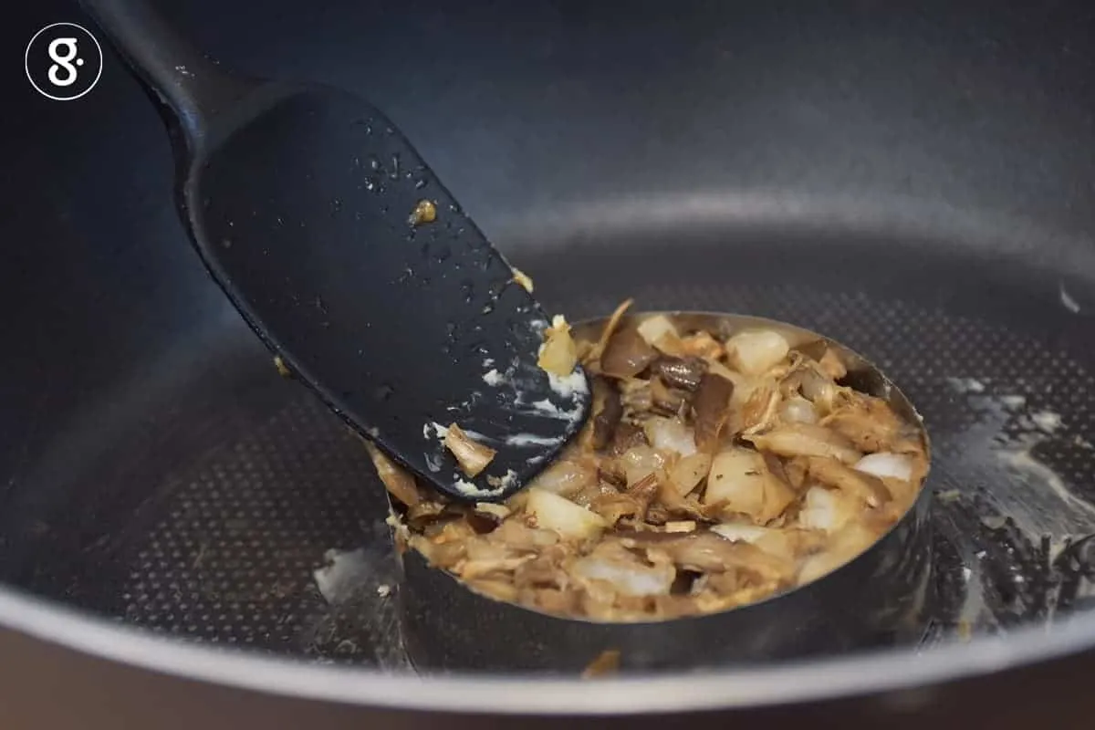 4. ตั้งกระทะไฟปานกลาง ใส่เนยสด วางพิมพ์วงแหวนตรงกลาง จากนั้น ปั้นก้อนไส้เบอร์เกอร์วางลงในพิมพ์วงแหวน รอให้สุกแล้วพริกกลับอีกด้านค่ะ เราก็จะได้ไส้เห็ดไว้สำหรับเบอร์เกอร์แป้งข้าวพื้นบ้านยีสต์น้ำหมักเสาวรสกันแล้ว