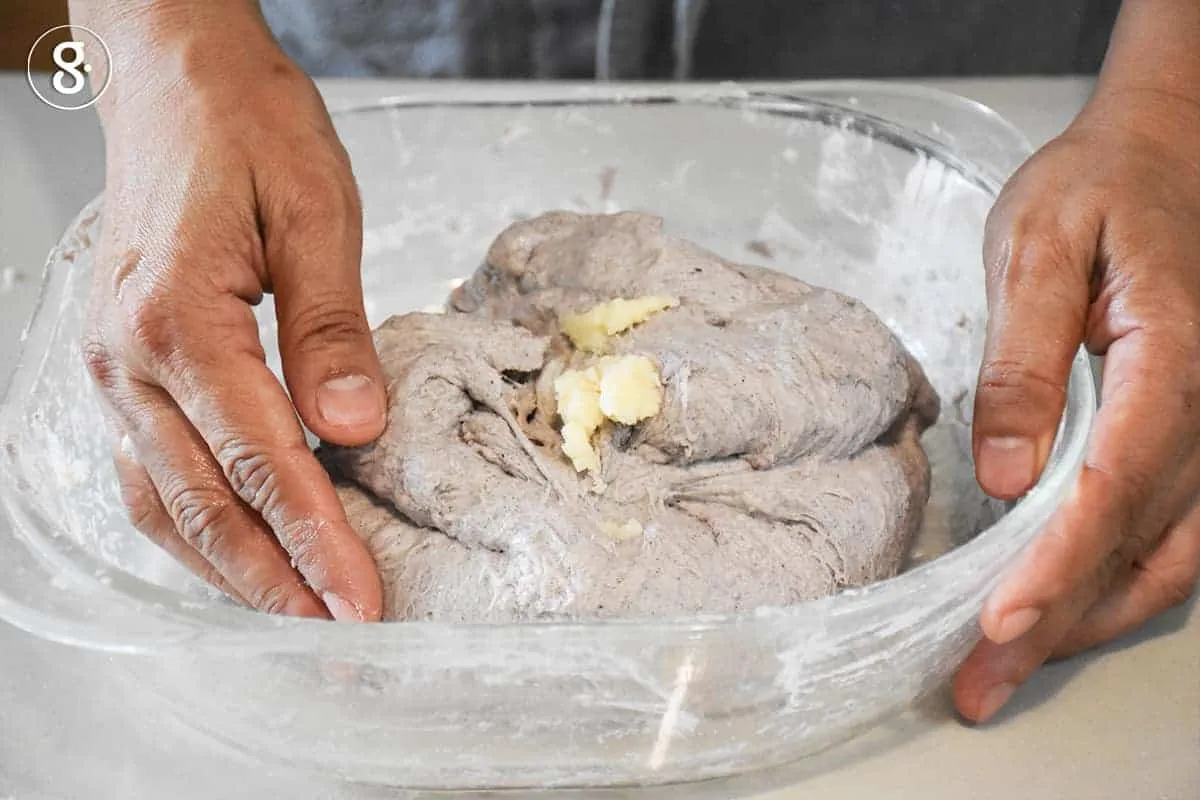 2. ใส่แป้งสาลีขนมปังไม่ฟอกสีและแป้งข้าวเหนียวดำออร์แกนิก น้ำตาลทรายแดง เกลือ นวดให้ส่วนผสมทั้งหมดเข้ากันไม่มีเม็ดแป้ง นวดจนได้กลูเตนประมาณ 60 เปอร์เซ็นต์ สังเกตได้จาก ลองนำแป้งโดมาขึงเป็นฟิล์มดู แผ่นฟิล์มแป้งจะมีลักษณะเนียนเนียนแต่ยังมีริ้วเนื้อแป้งเจืออยู่ ไม่ได้เนียนทั้งหมด