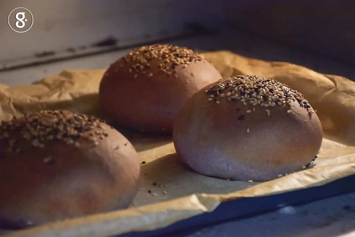 7. ก่อนเข้าอบ ให้ใช้แปรงทาผิวหน้าบันเบอร์เกอร์ด้วยนมถั่วเหลือง และโรยด้วยงาขาวบ้าน มากน้อยตามชอบเลย