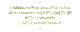 “มันเป็นเรื่องจำเป็นที่ต้องสร้างความรู้ความเข้าใจในทุกด้านให้กับทุกคน ไม่ใช่เพียงแค่ผู้บริโภค แต่ยังรวมถึงตัวผู้ผลิตเองด้วย เราเพิ่งได้ถอดบทเรียนอย่างหนึ่งจากการไปร่วมงานเกษตรอินทรีย์ เกษตรกรปลูกผัก ผลไม้ไม่ใช้สารเคมีก็จริง แต่เมื่อเราเข้าไปเยี่ยมห้องครัวกลับพบว่าในนั้นเต็มไปด้วยเครื่องปรุงรส ทั้งซีอิ๊วขาว ผงชูรส น้ำมันก็ยังคงเป็นน้ำมันพืชอยู่ ดังนั้นมันจะมีประโยชน์อะไรหากคุณมีวัตถุดิบที่ดี แต่คุณยังปรุงรสด้วยเคมีอยู่ การที่เราจะไปที่ใดๆ เราไม่ได้ต้องการเพียงแค่ขายของให้ได้อย่างเดียว แต่เราอยากเผยแพร่ความรู้ ทำให้คน รู้อยู่ รู้กิน รู้ใช้ ทำให้คนมีสุขภาพที่ดีขึ้น นั่นจึงเป็นเป้าหมายที่แท้จริงของเรา”