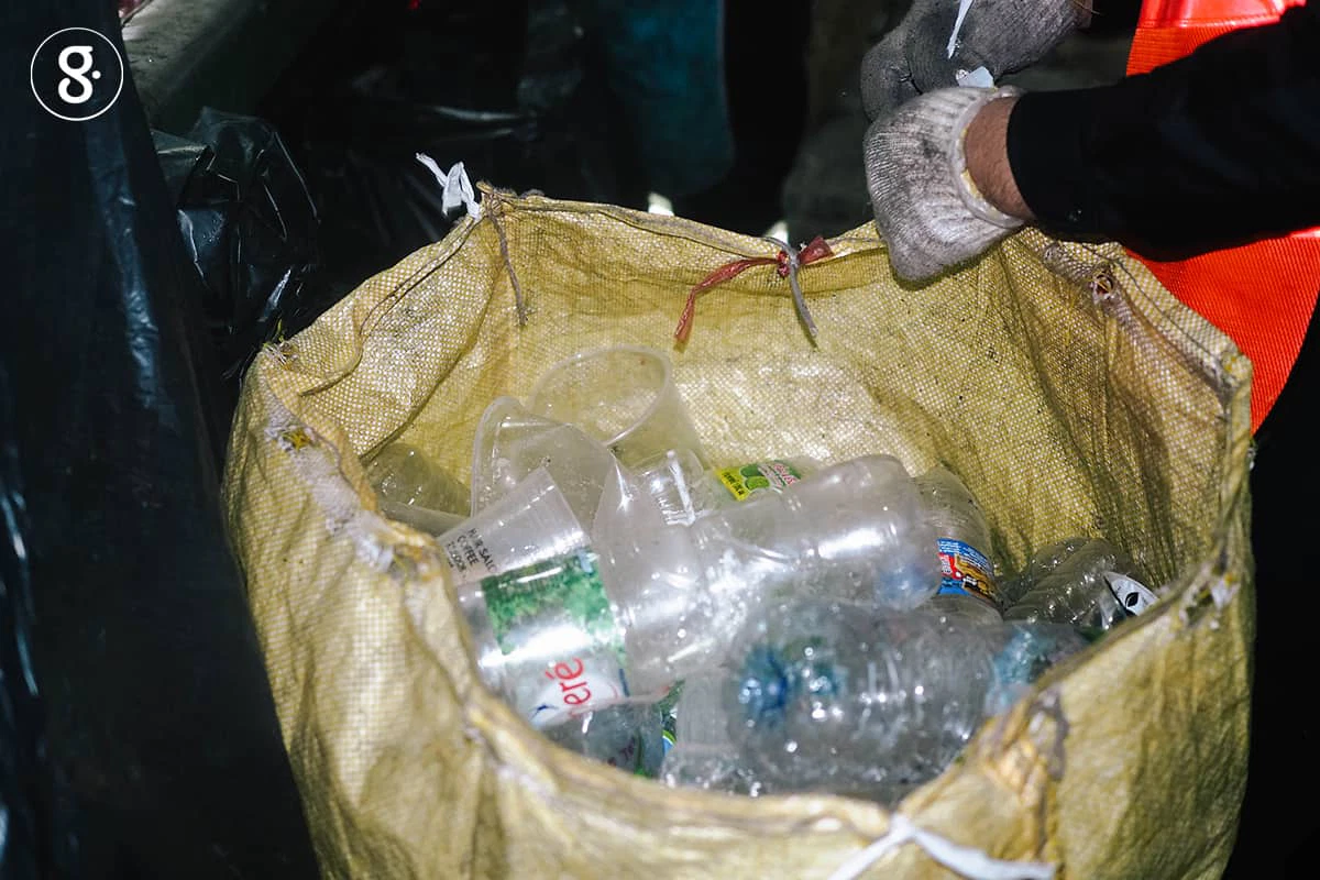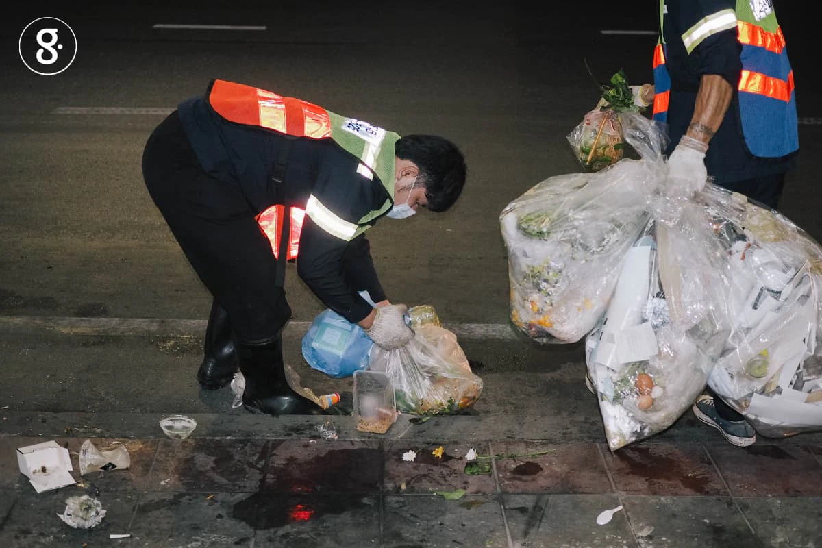 พี่ๆ พนักงานจะเริ่มเดินไล่เก็บขยะริมทาง ระหว่างที่รถขยะเคลื่อนตัวนำไปช้าๆ และจะจอดเมื่อเจอขยะกองใหญ่ ระยะทางกว่าสองกิโลเมตร ที่ทุกคนต้องเดินตามรถเพื่อเก็บกวาดขยะ ไม่ได้เกาะรถขยะเเละเก็บใส่ได้เลยแบบที่เราเคยจินตนาการไว้ ไม้กวาด ผ้าใบพื้นใหญ่ ถูกหยิบออกมาใช้เพื่อโกยขยะบนพื้นขึ้นรถ ขยะในถุงจะถูกเทออกเพื่อแยกเอา พลาสติก ขวดน้ำ กระป๋อง อะลูมิเนียม ขวดแก้ว เก็บใส่ถุงกระสอบที่พนักงานผูกไว้ท้ายรถ