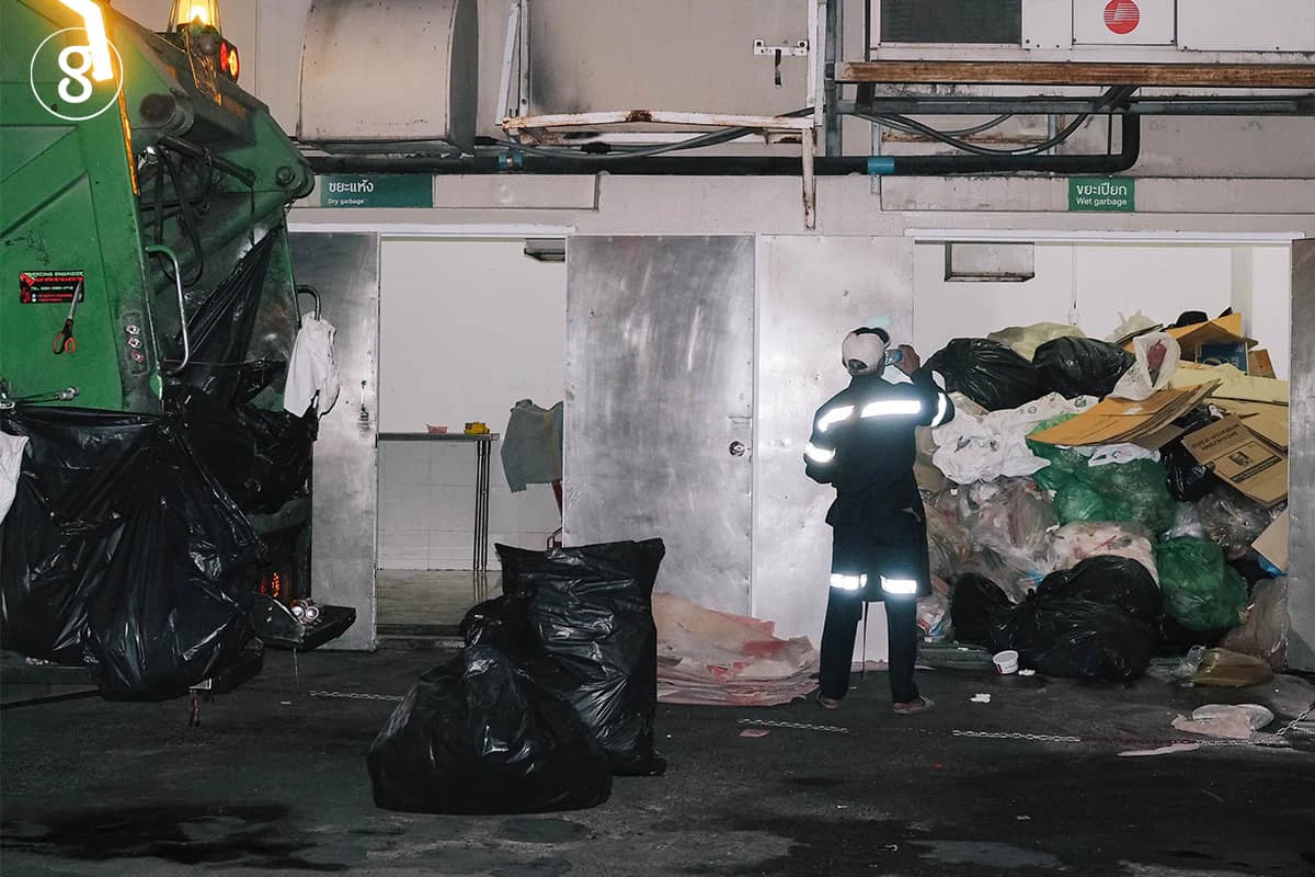 ในหนึ่งกะ จะมีพนักงานประมาณ 5 คน รวมคนขับ เริ่มเข้าประจำการตอนตีสอง ถุงมือ หน้ากากอนามัย เสื้อกั๊กเรืองแสง และรองเท้าบูต คือยูนิฟอร์มชิ้นสำคัญ พร้อมขึ้นประจำการบนรถ เมื่อจัดเก็บตามถนนและชุมชนเรียบร้อยแล้ว ปิดท้ายด้วยห้างสรรพสินค้า เก็บทั้งหมดแล้วเสร็จประมาณช่วงสายๆ จากนั้นรถขยะจะมุ่งไปยังโรงแยกขยะที่ใกล้ที่สุด ซึ่งมีที่อ่อนนุช สายไหม และหนองแขม เมื่อเทน้ำขยะและขยะเรียบร้อยก็จะวิ่งกลับเข้าอู่ ช่วยกันล้างทำความสะอาดรถ เสร็จภารกิจทั้งหมดประมาณเที่ยงวัน ถึงได้เวลาของอาหารมื้อแรก