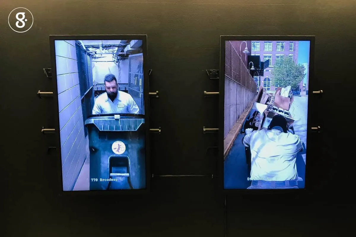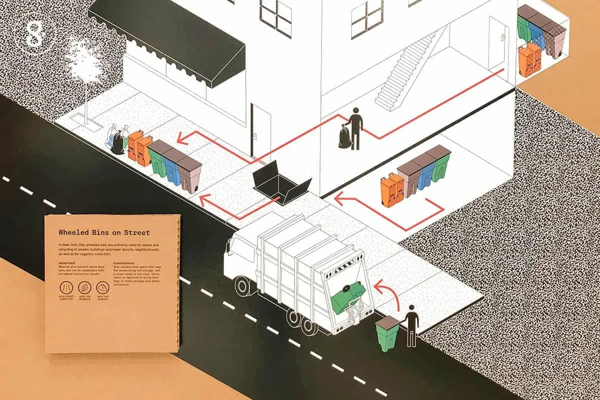 ตัวนิทรรศการเริ่มด้วยการเล่ากระบวนการจัดเก็บขยะในเมือง ปัจจุบันการจัดการขยะในนิวยอร์กตอนนี้คือแต่ละอาคารจะนำถุงขยะมาวางไว้บนทางเดินหน้าอาคาร หรือหน้าบ้านเพื่อรอให้รถขยะมาเก็บแบบเดียวกับบ้านเรา แต่ที่นี่รถขยะจะมี 2 ระบบคือ จาก Sanitation Department หน่วยงานของรัฐ ที่เก็บขยะจากอาคารที่พักอาศัย บริษัทเอกชน เก็บจากอาคารพาณิชย์ โดยเจ้าของอาคารเป็นผู้เลือกจ้างและรับผิดชอบค่าใช้จ่าย ตารางการจัดเก็บก็จะแตกต่างกันไปตามแต่ละบริษัท โดยส่วนใหญ่รัฐจะเก็บขยะเวลากลางวัน