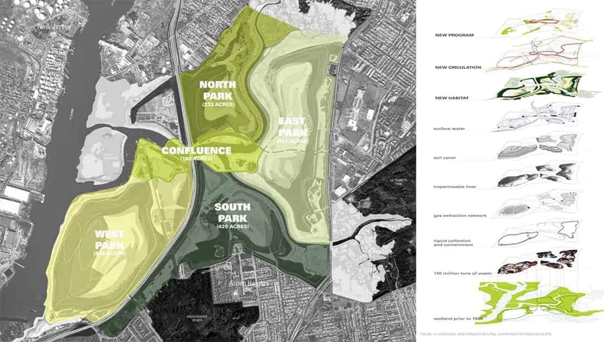 หลังจากนั้นทางเมืองนิวยอร์กจึงได้เริ่มโครงการที่จะพัฒนาพื้นที่แห่งนี้ให้กลายเป็นสวนสาธารณะโดยเริ่มเปิดให้ประกวดแบบในปี 2001 และได้ผู้ชนะในปี 2003 คือ บริษัท James Corner, Field Operation (ผู้ออกแบบเดียวกับ The High Line) เฟรชคิลพาร์คมีขนาด 5,560 ไร่ (15 เท่าของสวนลุม) สวนนี้ไม่เพียงจัดการขยะ แต่มีเป้าหมายเพื่อฟื้นฟูระบบนิเวศ สภาพแวดล้อมที่ดีให้ทั้งคนและสัตว์ และเป็นของขวัญตอบแทนชาวเกาะ Staten จึงวางแผนการพัฒนาแบบจากพื้นที่วงนอกเข้าวงใน (outside-in) เพื่อให้คนที่อาศัยอยู่ใกล้เคียงได้มีโอกาสเข้ามาใช้สวนไปพร้อมๆ กับการพัฒนาส่วนอื่นๆ ไปด้วย