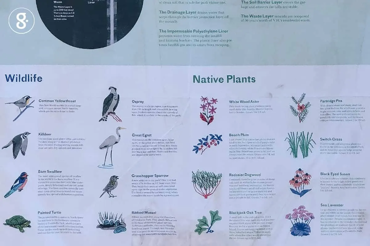 Planting Soil Layer เป็นชั้นดินสะอาดสำหรับปลูกพืช หนาอย่างน้อย 6 นิ้ว ข้อสังเกตคือที่นี่จะไม่มีต้นไม้ใหญ่ๆ เหมือนสวนอื่นๆ เพราะรากต้นไม้จะไปทำลาย landfill cap ต้นไม้ขนาดกลางที่เราเห็นคือต้นไม้ที่มีอยู่เดิมหรือเอามาจากบริเวณใกล้เคียง