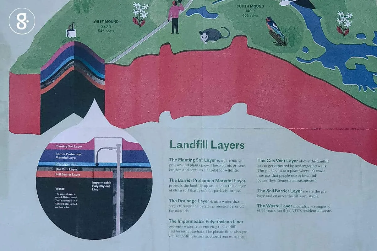 โครงสร้างของผืนดินที่นี่ แบ่งออกเป็น 7 ชั้น ภายใต้ผืนดินที่มีต้นไม้ปกคลุมอยู่ มีพระเอกคือส่วน Landfill cap ซึ่งเป็นชั้นที่คลุมขยะไว้ หนา 3-12 ฟุต แล้วลึกลงไปจากนั้น ก็ประกอบไปด้วยส่วนประกอบอีก 7 ชั้น ดังนี้