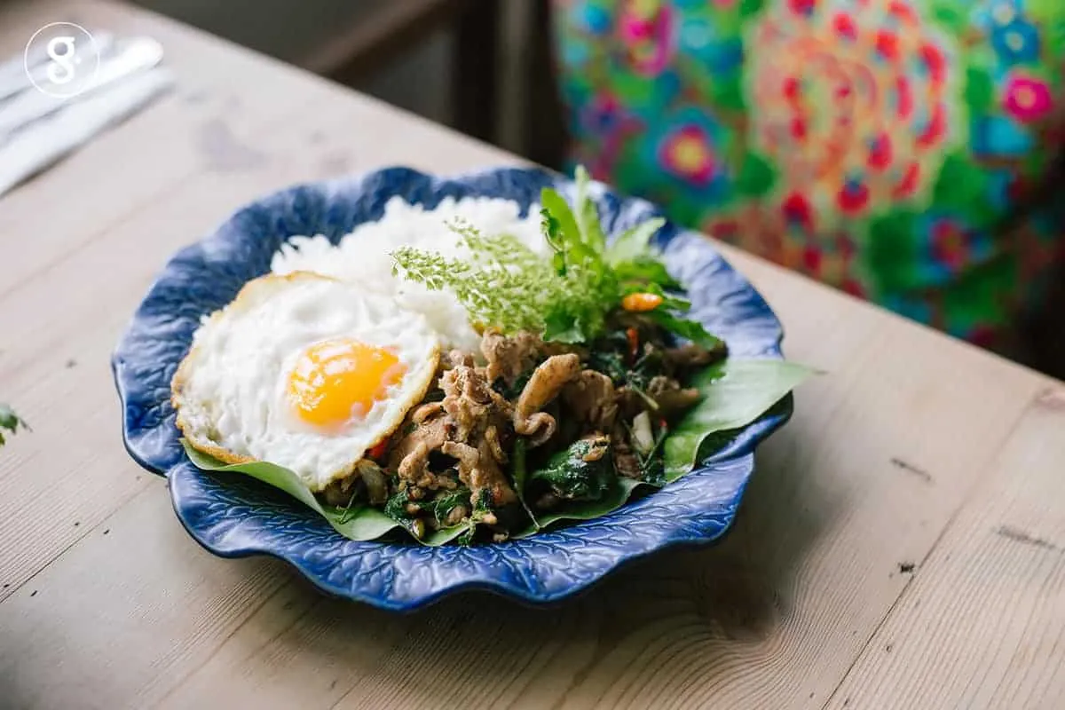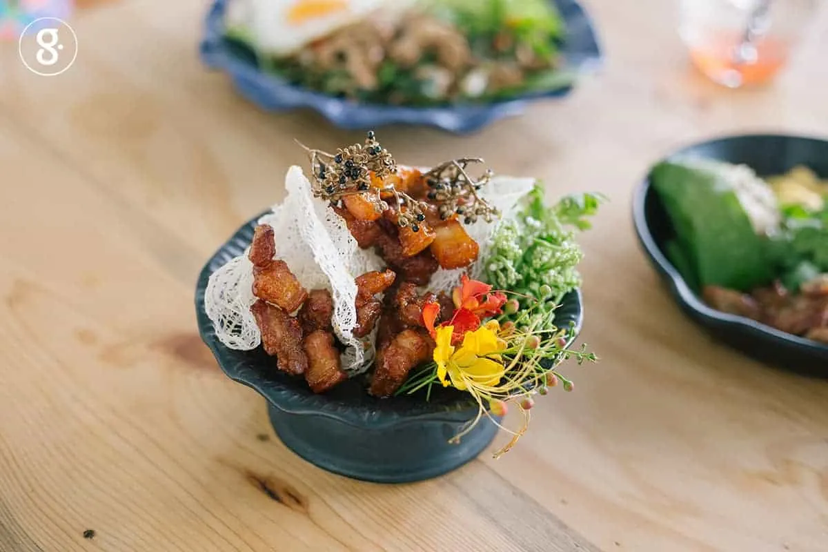 เพราะอย่างนั้น เราจึงเห็นอาหารไทยในคาเฟ่ของแอ้มเต็มไปด้วยความสนุก มีการพลิกแพลงให้กินง่ายเหมาะกับคาเฟ่ และเสิร์ฟมาในองค์ประกอบที่ไม่ตามธรรมเนียมแต่ยังสัมผัสได้ถึงความเป็นไทย เช่น จานชามลายไทยสวยแปลกตาซึ่งแอ้มออกแบบมากับมือ