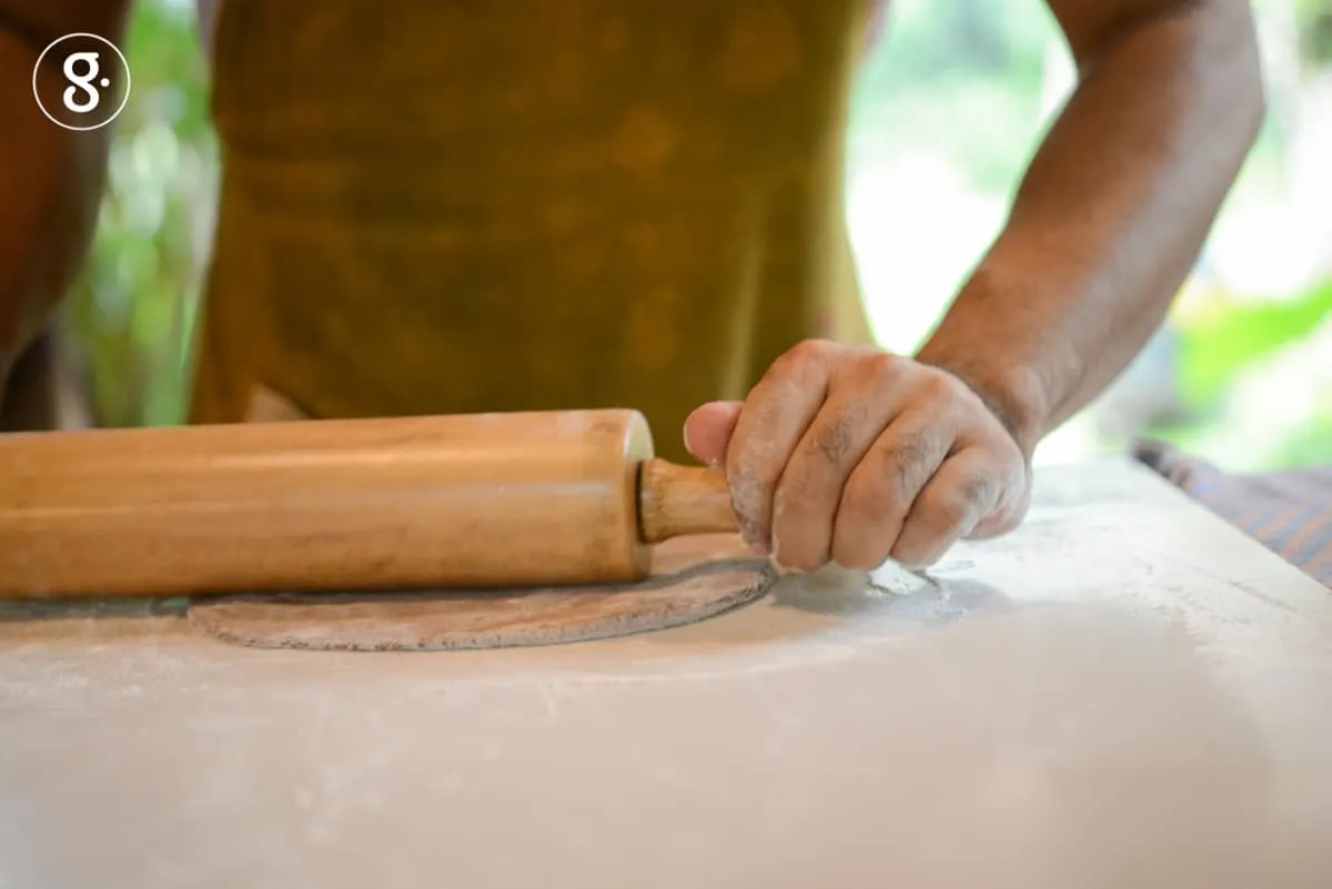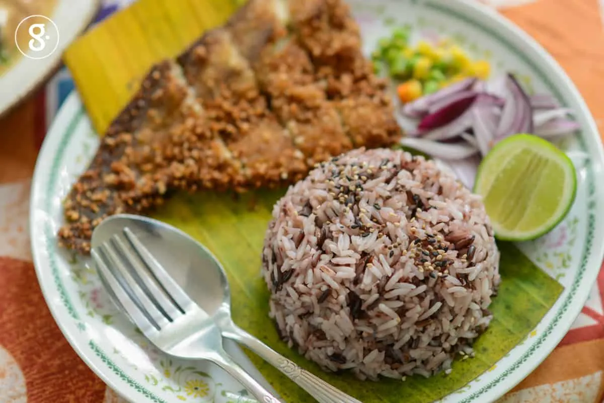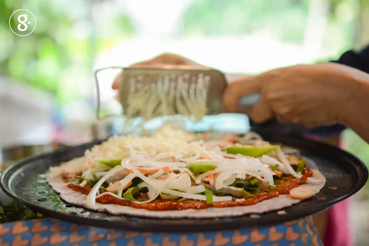 จากนั้นต่อด้วยเมนูขึ้นชื่อที่ทุกคนที่มาเยือนต้องสั่งมาลองกัน นั่นก็คือ พิซซ่าแป้งข้าวหน้าผักพื้นบ้าน อบด้วยเตาดิน เก็บผักเหลียงสดๆ จากสวนยางพาราข้างบ้านวันต่อวัน เรียกได้ว่าสดจากสวนจริงๆ วันนี้ที่ร้านเลือกใช้แป้งข้าวสายพันธุ์เมล็ดฝ้าย 62 ซึ่งเป็นพันธุ์ข้าวไร่พื้นบ้านจากพื้นที่ของนครศรีธรรมราช รสชาติและสีสันมีเสน่ห์ อีกทั้งมีเรื่องราวน่าประทับใจมาก