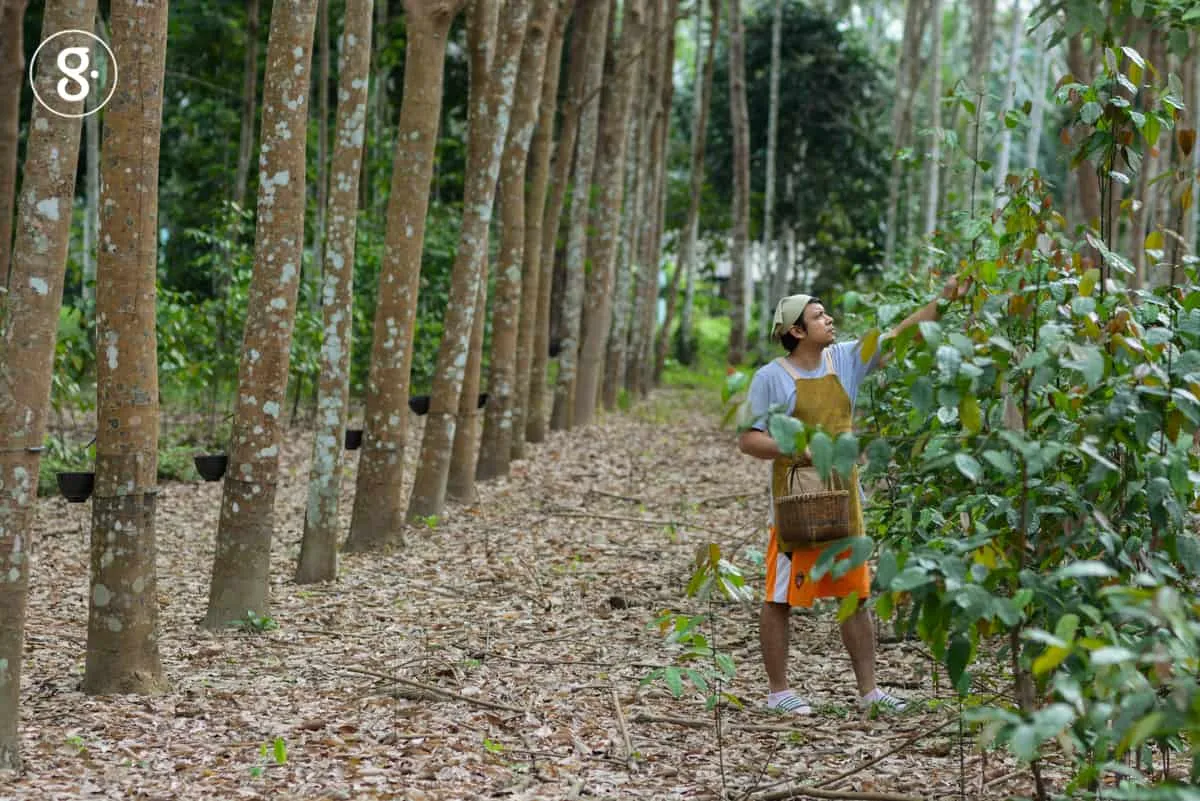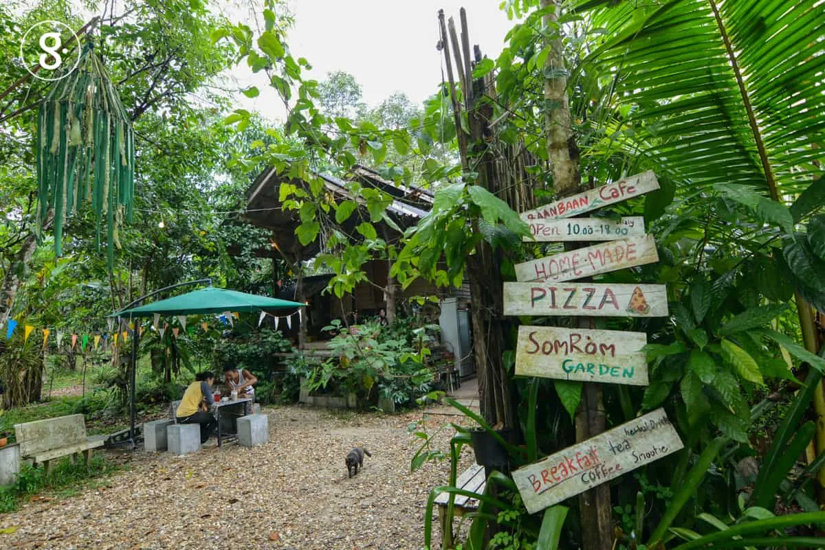 ก้าวลงจากรถ สัมผัสแรกใบหน้าปะทะกับความเย็นสดชื่น เสียงนกป่านานา ประสานกับเหล่าจักจั่นของต้นยามหน้าร้อนแห่งภาคใต้ แว่วเสียงเป็ดไก่และห่านดังมาจากทางด้านท้ายสวน จอดรถเยื้องกับต้นยางนายักษ์ อายุอานามน่าจะเกินร้อยปี บรรยากาศที่นี่คล้ายสวนดึกดําบรรพ์ มากกว่าจะเป็นร้านอาหารสักร้านหนึ่ง ภายใต้ร่มเงาของพันธุ์ไม้สวนที่หลากหลาย ไม่ว่าจะเป็น ทุเรียน เงาะ มังคุด ลองกอง ลูกเนียง ลางสาด กล้วยนานาชนิด ยังมีไม้ป่าพื้นถิ่นอีกหลายชื่อหลายนาม ที่เรายังไม่ได้ทำความรู้จัก สวนของที่นี่ ดูๆ แล้วจึงน่าจะเป็นรูปแบบของสวนสมรมที่ปลูกพืชพันธุ์แบบผสมผสาน ที่น่าสนใจมากเลยทีเดียว